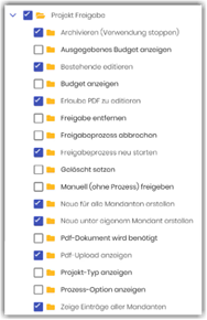 Projekte können vor ihrer Verwendung einen Freigabeprozess durchlaufen. Dies ermöglicht eine interne Kontrolle und Genehmigung durch Verantwortliche, bevor Projekte aktiv genutzt werden. Der Freigabeprozess ist optional und kann mandantenspezifisch konfiguriert werden.