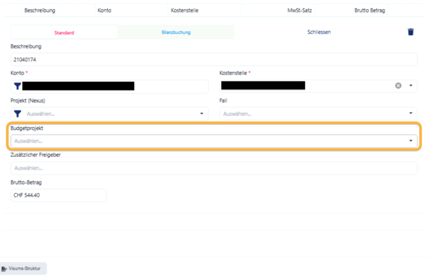 Projekte können innerhalb der Kontierung ausgewählt werden. Dies ermöglicht, Buchungen direkt einem Projektbudget zuzuordnen. Im Feld „Budgetprojekt“ kann das gewünschte Projekt ausgewählt werden, sodass alle zugehörigen Ausgaben im Dashboard korrekt summiert werden.