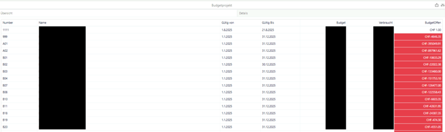 Im Dashboard kann eingesehen werden, welches Projekt wie viel Budget offen hat. Ebenfalls kann überprüft werden, welche Belege kein Projekt gesetzt haben. Dadurch behalten Sie stets den Überblick über die Budgetauslastung und potenzielle Zuordnungsfehler.